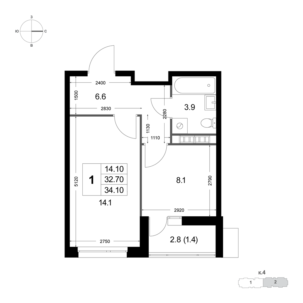1-комнатная 34.1 м
