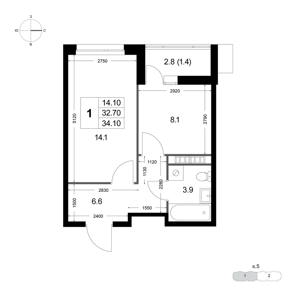 1-комнатная  37.1 м2