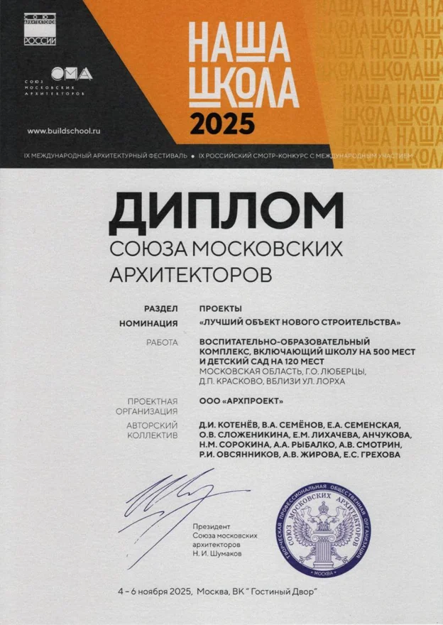 Рады сообщить, что архитектурная концепция образовательного комплекса, реализуемого в рамках проекта «Легенда Коренёво», получила Диплом Союза московских архитекторов в номинации «Лучший объект нового строительства» IX Международного архитектурного фестиваля «Наша школа 2025».